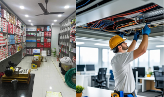 Complete electrical setup for commercial spaces including lighting, sockets, power extensions, and panel upgrades.